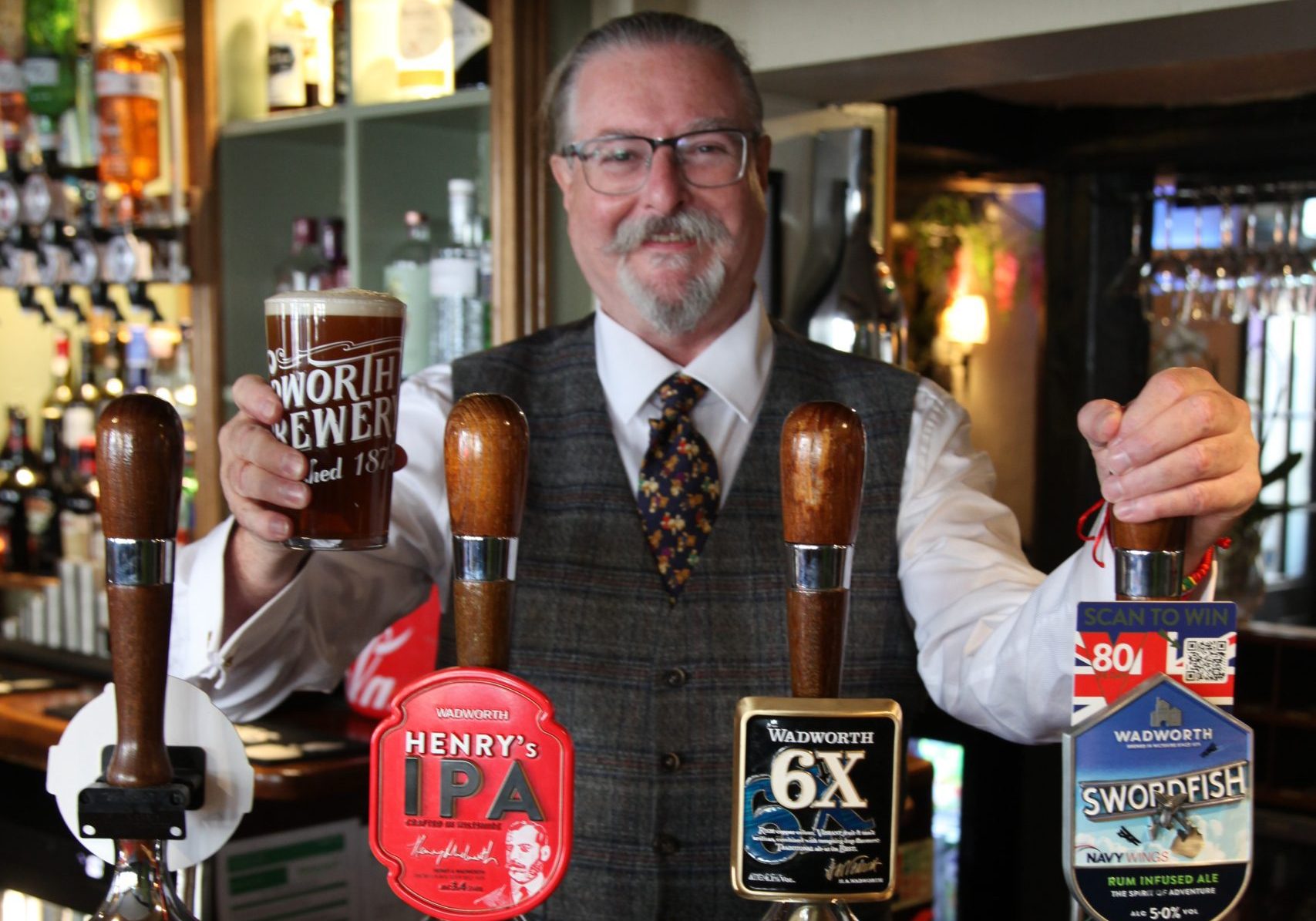 Pictured: James Sullivan-Tailyour raises a glass to the Old Bell’s CAMRA Good Beer Guide debut