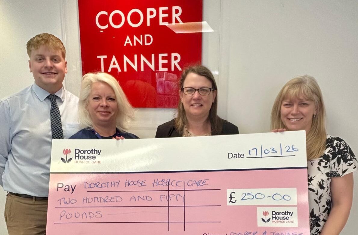 Pictured: Cooper and Tanner staff presenting the cheque to Dorothy House.