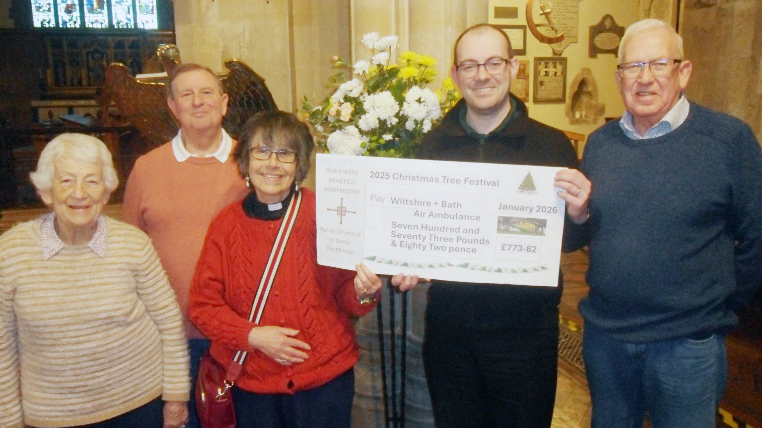 Proceeds from last year’s Christmas Tree Festival at St Denys, the Minster Church in Warminster, have helped fund the lifesaving charity, with a cheque for £773.82 being presented recently by Revd Carole Owen and representatives from the church.