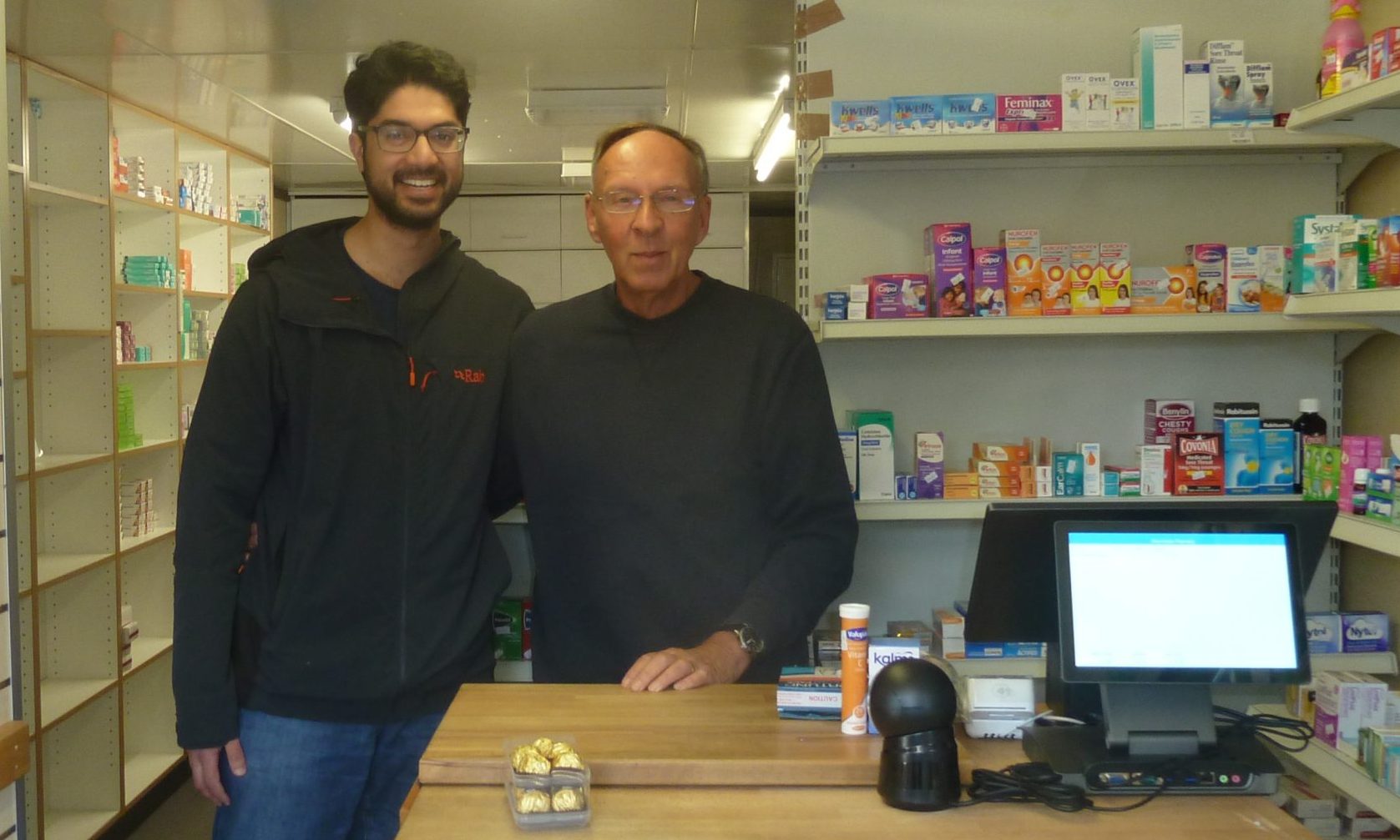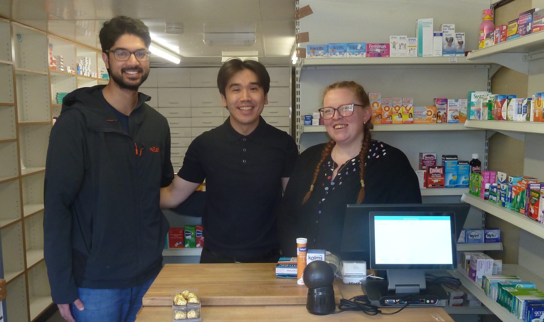 Pictured right: Nikhil and David. Left: Nikhil with pharmacist Chung Yi and dispenser Anita. Below: the pharmacy