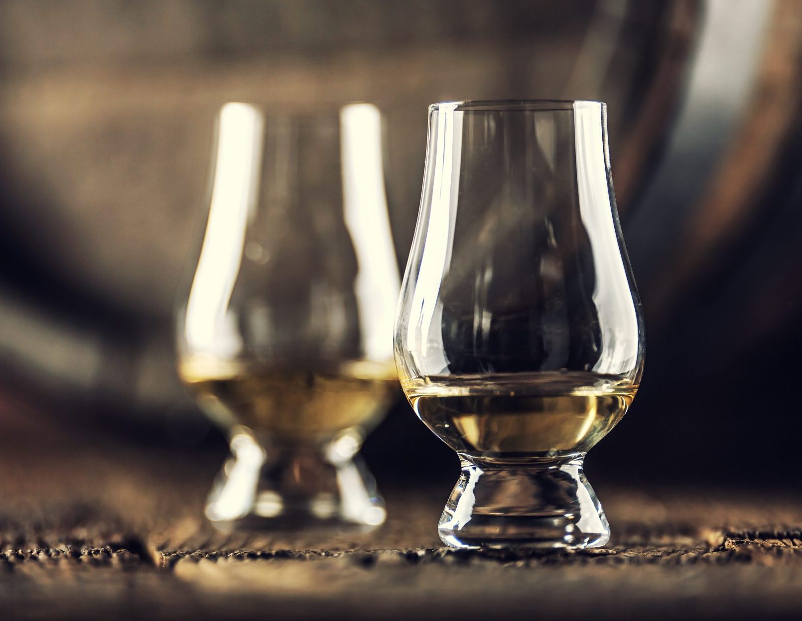 Two Glencairn whisky tasting glasses on vintage wood and dark wooden barrel in the back.