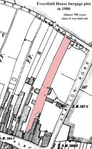 These burgage plots, set up in the early 1200’s, lasted a very long time, and many are still identifiable today. If you walk a short way along the Avenue from Station Road, you will see an old blue gate. This gate still has its old surrounding structure, and you can just make out “Eversfield House”. Eversfield House still exists. Eversfield House is (was) M&Co in Market Place and is three burgage plots wide.