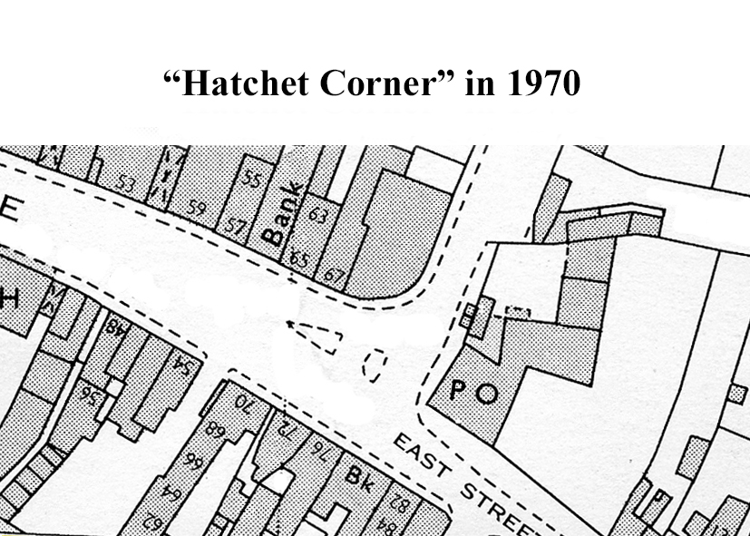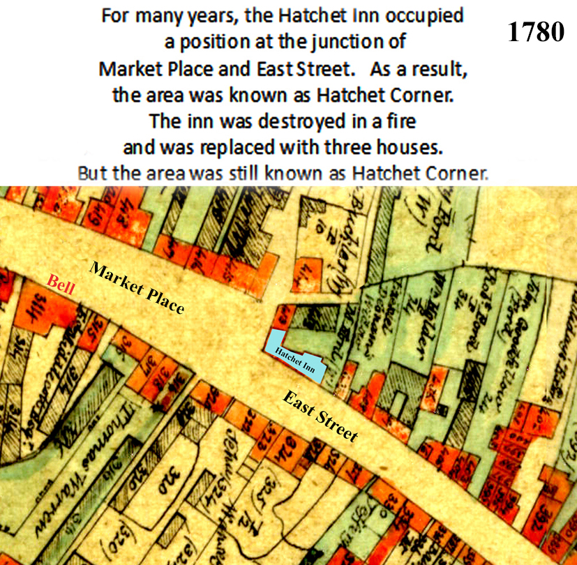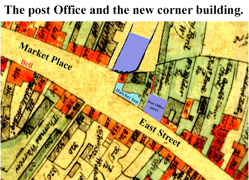 Three map sections show the major alterations necessary to construct Station Road.  The old map, drawn in 1780, shows the original area where Market Place meets East Street.