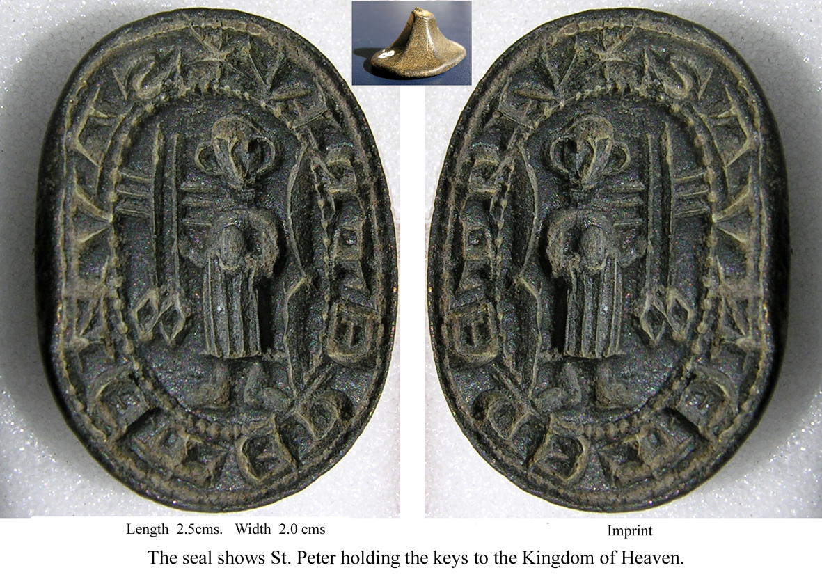 Probably the most interesting artefact in the Warminster museum’s collection is a seal matrix.  Official documents were sealed with sealing wax, and the matrix was the small stamping tool that left the official imprint in the wax. The matrix would have a ring at the top, so that the matrix could be safely attached to a belt that the official or the messenger was wearing. The matrix in the museum is broken. It has lost the top fixing ring, so it can no longer remain attached to a belt. The broken matrix was found in a garden next to the path from the church to the road.
