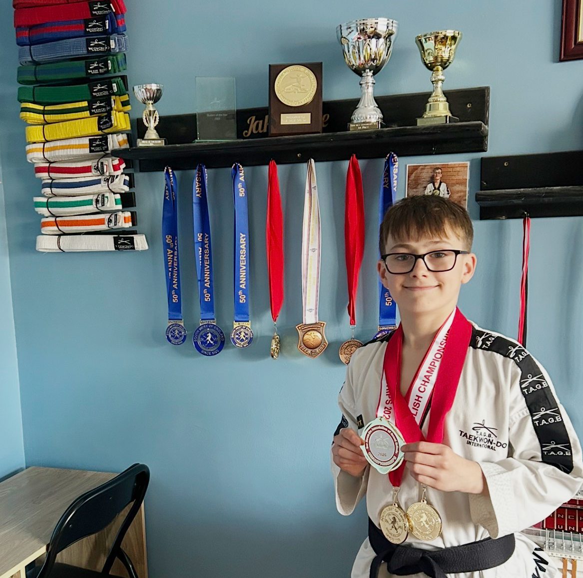 Jake’s instructor, Richard Latham, who is a 7th Degree World Master, said, “Since Jake passed his black belt just before his 11th birthday, he has accelerated his progress in taekwondo. Receiving the best junior at a black belt grading award near the end of 2025, winning gold in both individual patterns and sparring at the regional tournament and now winning gold at a national competition is incredibly impressive.